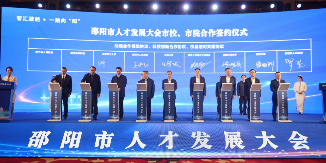 會議現場還舉行了《邵陽院士》新書首發儀式和合作簽約儀式。邵陽市與深圳大學、湘潭大學、湖南農業大學、湖南科技大學、湖南省農業科學院、復旦大學高分子科學系簽訂市校(市院)合作協議;全市10個“揭榜掛帥”科技項目和重大科技人才項目同步簽約。市領導王永紅、肖擁軍、諸葛軍、楊衛平、晏麗君、李長躍、胡小剛等出席,市委常委、組織部部長、統戰部部長龔紅果推介邵陽市人才政策并發布人才需求信息。會前,與會人員參觀了邵陽與高校(院所)合作科技成果轉化展。