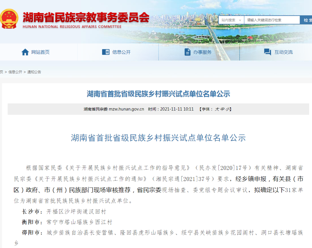 11月11日,湖南省民宗委對湖南省首批省級民族鄉村振興試點單位名單進行公示,全省共有31家單位入選,其中邵陽有4個鄉鎮村上榜:城步苗族自治縣長安營鎮,隆回縣虎形山瑤族鄉,綏寧縣關峽苗族鄉花園閣村,洞口縣長塘瑤族鄉。