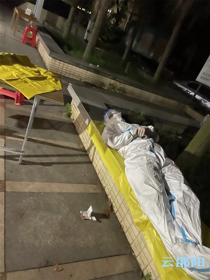 4月19日晚上8時許,我突然接到科室通知,隨時待命,準備支援雙請區核酸采樣工作。盡管當時已經在手術室工作忙碌了一天,但疫情就是命令。接到通知后,我馬上在家里整理好行李。9時30分左右,我緊急趕到醫院聽候指令。當晚,我接到的第一個任務就是前往雙請區雍翠豪苑小區進行全員核酸采樣工作,和我一同前往的有護理部副主任楊金美和護士湯盼兩位隊友。采樣從19日晚10時一直持續到次日凌晨,居民才慢慢變少。這時我和隊員們已經非常疲憊且困乏。趁著暫時沒有人,我在花壇旁邊小憩了一會,被隊員拍下了這張照片。