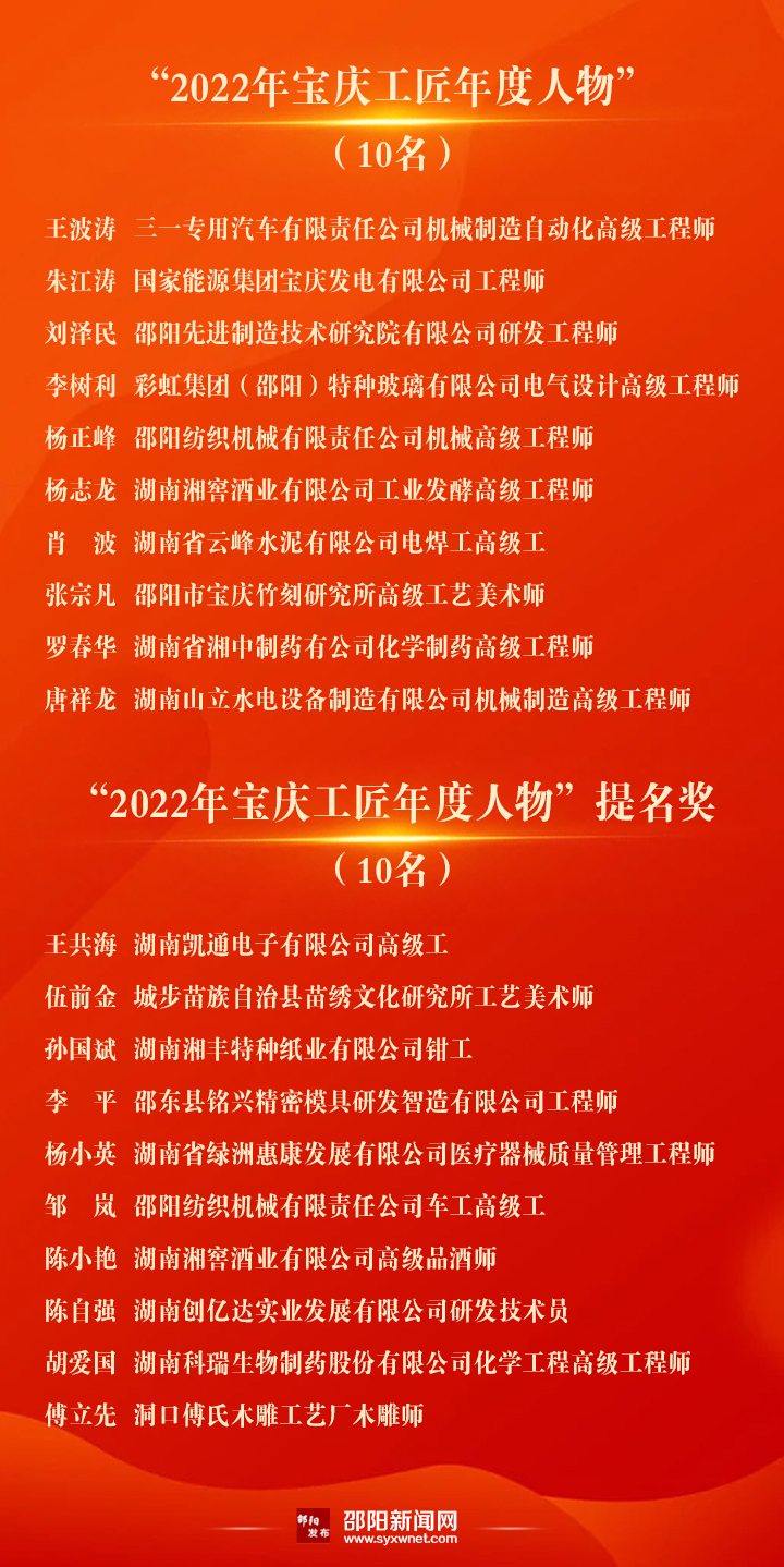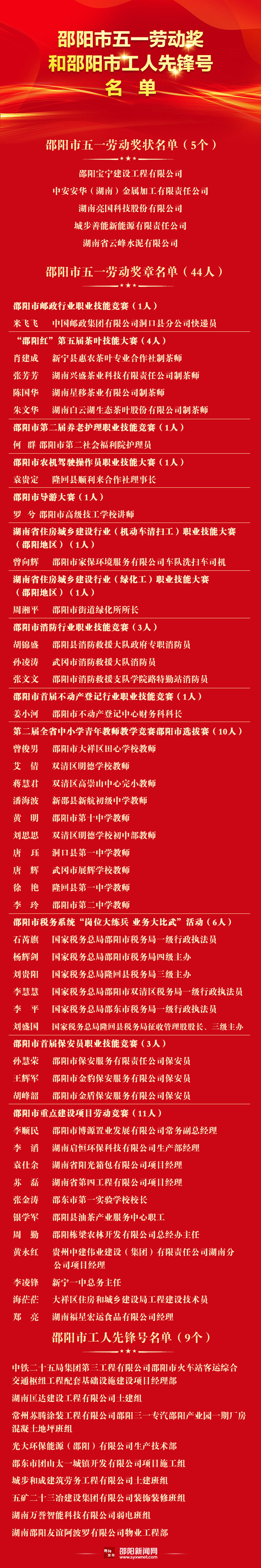 根據(jù)表彰決定,王波濤等10名同志被授予“2022年寶慶工匠年度人物”榮譽(yù)稱號,王共海等10名同志被授予“2022年寶慶工匠年度人物”提名獎榮譽(yù)稱號,邵陽寶寧建設(shè)工程有限公司等5個單位被授予“邵陽市五一勞動獎狀”,米飛飛等44名職工被授予“邵陽市五一勞動獎?wù)隆保需F二十五局集團(tuán)第三工程有限公司邵陽市火車站客運(yùn)綜合交通樞紐工程配套基礎(chǔ)設(shè)施建設(shè)項(xiàng)目經(jīng)理部等9個集體被授予“邵陽市工人先鋒號”。
