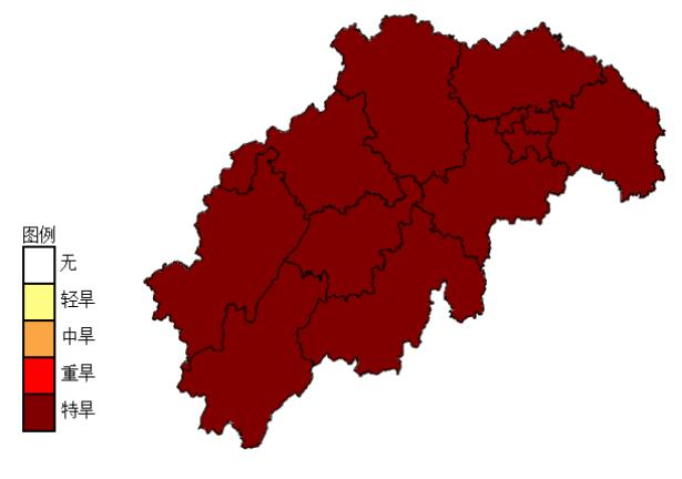 截至10月03日20時,全市氣象干旱達(dá)特旱標(biāo)準(zhǔn)面積為20820平方公里,占比達(dá)100%。