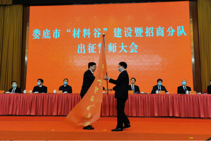 1月29日,婁底市“材料谷”建設暨招商分隊出征誓師大會舉行。婁底市委書記鄒文輝為12支“材料谷”招商分隊授旗。