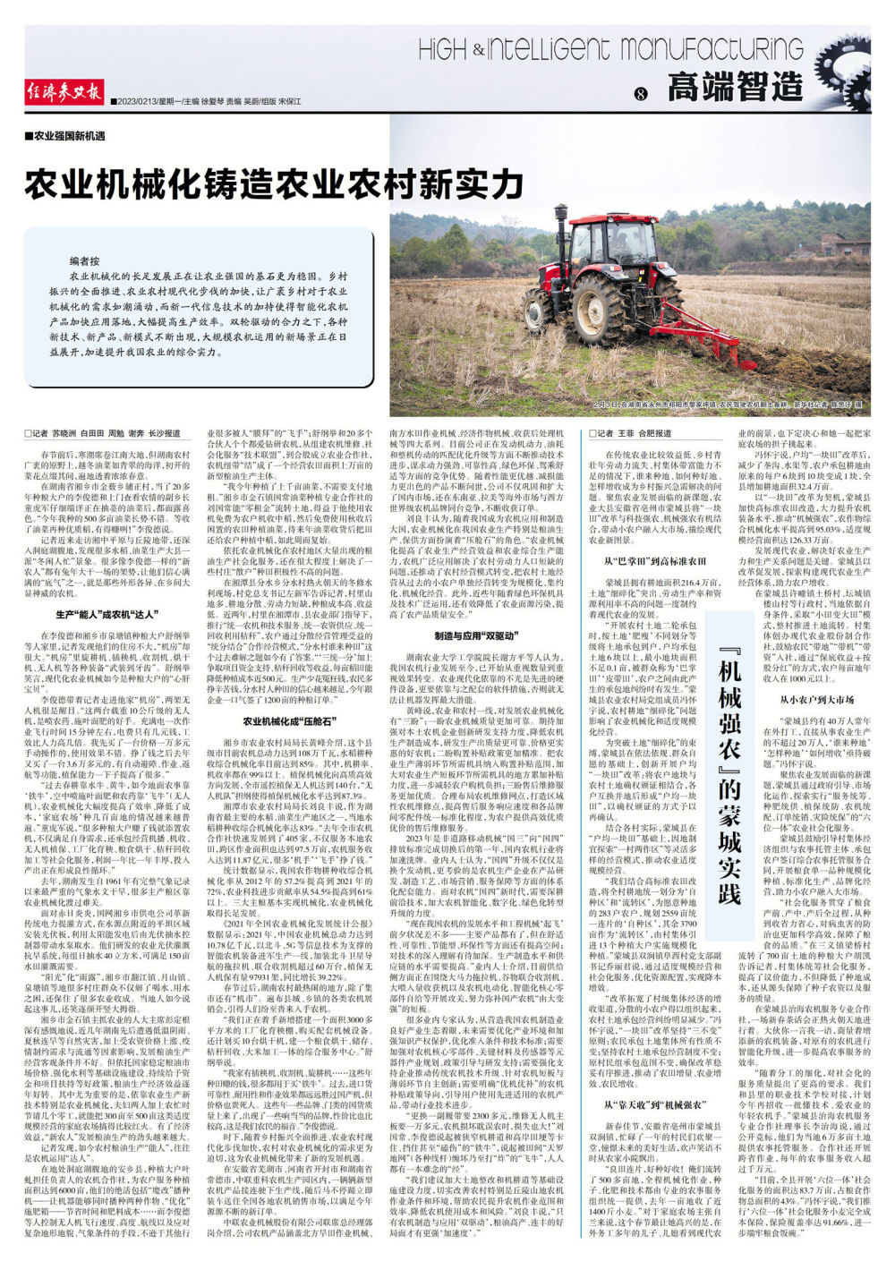 記者近來走訪湘中平原與丘陵地帶,還深入洞庭湖腹地,發(fā)現(xiàn)很多水稻、油菜生產(chǎn)大縣一派“冬閑人忙”景象。很多像李俊德一樣的“新農(nóng)人”都有兔年大干一場的架勢,讓他們信心滿滿的“底氣”之一,就是那些外形各異、在鄉(xiāng)間大顯神威的農(nóng)機(jī)。