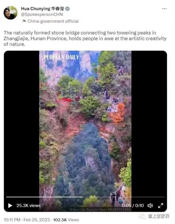 華春瑩在推文中寫道:“湖南張家界這座天然形成的石橋連接著兩座巍峨的山峰,讓人驚嘆于大自然的藝術創造力。”同時,配有10秒時長的張家界天然石橋游人如織的短視頻。