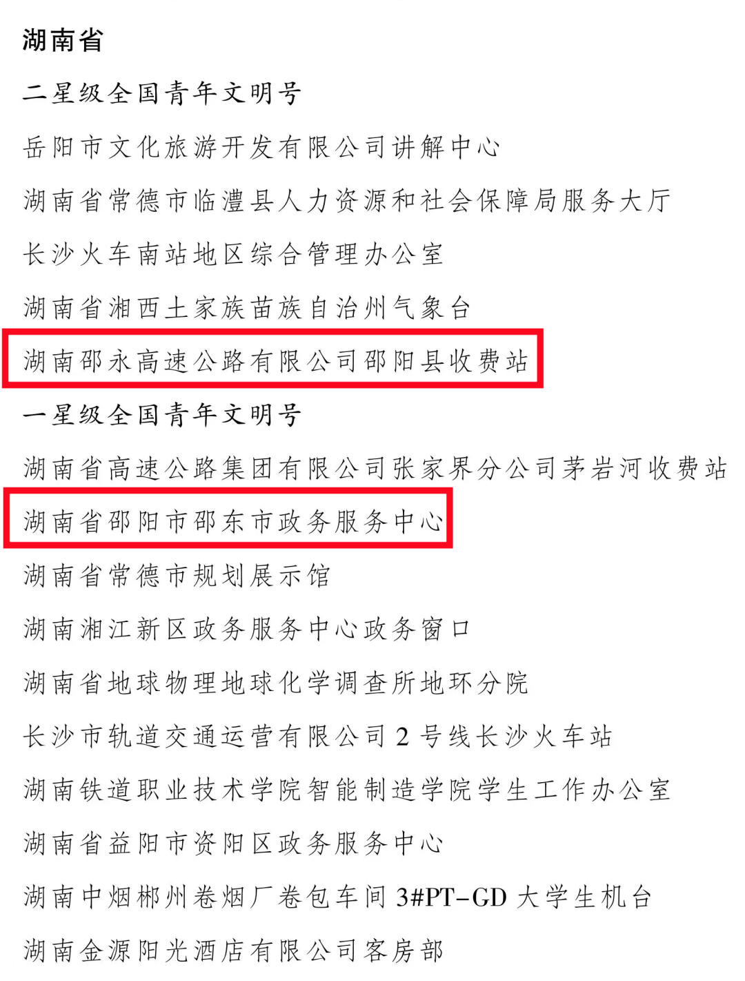 近日,共青團中央、最高人民法院、國家發展改革委、工業和信息化部、公安部、司法部、自然資源部、住房城鄉建設部、交通運輸部、水利部、商務部、文化和旅游部、國家衛生健康委、應急管理部、國務院國資委、海關總署、稅務總局、市場監管總局、廣電總局、金融監管總局、全國工商聯、全國供銷合作總社、國鐵集團等23家全國創建青年文明號活動組委會成員單位聯合印發《關于命名第21屆全國青年文明號并進行星級認定的決定》,命名1932個集體為“第21屆全國青年文明號”,其中,認定709個集體為首批“二星級全國青年文明號”,認定1223個集體為“一星級全國青年文明號”。邵永高速公路有限公司邵陽縣收費站被認定為“二星級全國青年文明號”,邵東市政務服務中心被認定為“一星級全國青年文明號”。